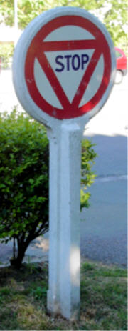 Les poteaux situés à l’entrée de ces squares sont différents des précédents : support et arête supérieure droits. De plus, un Stop rond est inséré dans leur dos. Ces poteaux datent du 3-2-68. |